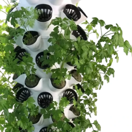 Dikey Topraksız Tarım Kule Sistemi, 20 adet 8 saksılı modülden oluşur. Modüller, bitkilerin köklerinin sağlıklı bir şekilde büyüyebilmesi için tasarlanmış file saksılarla donatılmıştır. Bu saksılar, köklerin havalanmasını sağlar ve besin çözeltisinin eşit bir şekilde dağılmasını kolaylaştırır. Her modül, bitkilerin büyümesi için yeterli alan sağlar ve dikey yerleşim sayesinde alan tasarrufu sağlar.